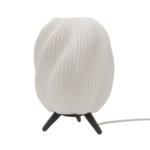 Diese Lampe vereint modernes Design mit nachhaltiger Fertigung. Der Lampenschirm wird im 3D-Druckverfahren Schicht für Schicht aus recyceltem PETG und PLA hergestellt und anschließend von Hand montiert und geprüft.