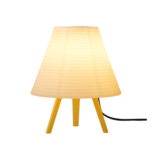 Diese Lampe vereint modernes Design mit nachhaltiger Fertigung. Der Lampenschirm wird im 3D-Druckverfahren Schicht für Schicht aus recyceltem PETG und PLA hergestellt und anschließend von Hand montiert und geprüft.